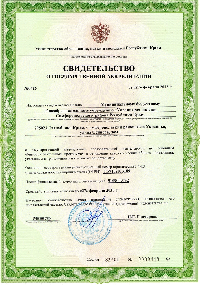 295023, Российская Федерация, Республика Крым, Симферопольский район, с. Украинка, ул. Осипова, 1